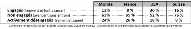 Le sondage réalisé dans 142 pays sur la période 2011-2012 a établi que 13% seulement des employés sont réellement engagés dans leur travail. La situation est sensiblement pire en France où, pour 9 % de collaborateurs engagés, il y a près de 3 fois plus de (pseudo)collaborateurs activement désengagés. Le tableau ci-dessous présente quelques situations caractéristiques au niveau mondial.